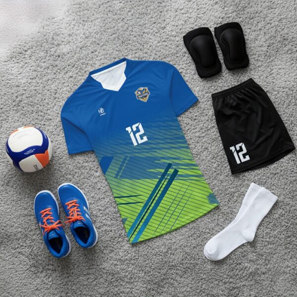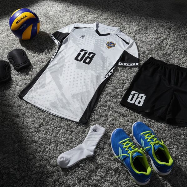 Bộ đồng phục bóng chuyền BC02-VNC068 với tông màu trắng đen cá tính, chất liệu thể thao thoát mồ hôi và giày xanh neon nổi bật – lựa chọn lý tưởng cho mọi đội bóng chuyên nghiệp.