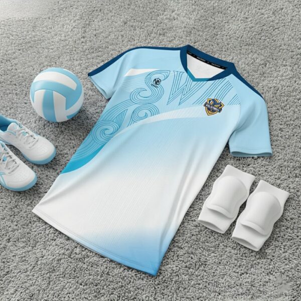 Áo bóng chuyền thể thao BC02-VNC068 màu trắng xanh gradient, thiết kế unisex hiện đại, chất vải co giãn và thấm hút tốt – lý tưởng cho thi đấu & tập luyện thể thao.